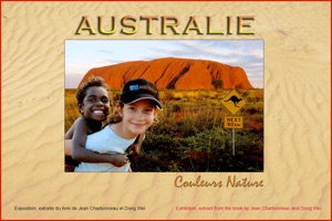 Depuis 10 ans, Jean Charbonneau et Dong Wei sillonnent régulièrement l’Australie, dépassant aujourd’hui 110 000 kilomètres en 4 x 4 sur tout cet immense continent. Ils ont choisi de vous faire partager cette terre insolite sous le signe original des couleurs : BLANC comme les grandes cités et leurs habitants, BLEU comme l’océan, les plaisirs côtiers, les fonds sous-marins, VERT comme la jungle tropicale et les forêts d’eucalyptus, ROUGE comme les déserts et le monolithe d’Uluru, NOIR comme la peau aborigène…